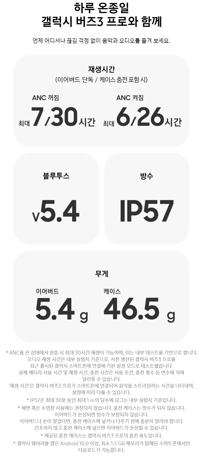 | 재생 시간 (이어버드) | ANC 꺼짐 최대 7시간 / 켜짐 최대 6시간 |